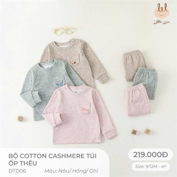 Bộ dài tay coton cashmere túi ốp thêu dành cho bé Lil Little Love (DTD06)